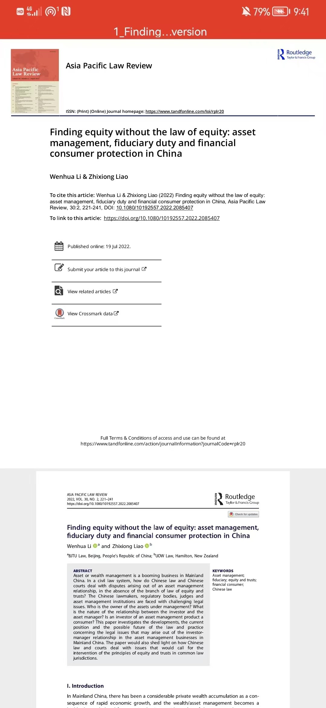 《Asia Pacific Law Review(亚太法律评论)》近期刊发了英国上市公司365副教授李文华老师和新西兰怀卡托大学英国上市公司365教师廖志雄博士合撰的论文《Finding Equity without the Law of Equity: Asset Management, Fiduciary Duty and Financial Consumer Protection in China(在没有衡平法的情况下寻找衡平:中国的资产管理、信义义务与金融消费者保护)》。
