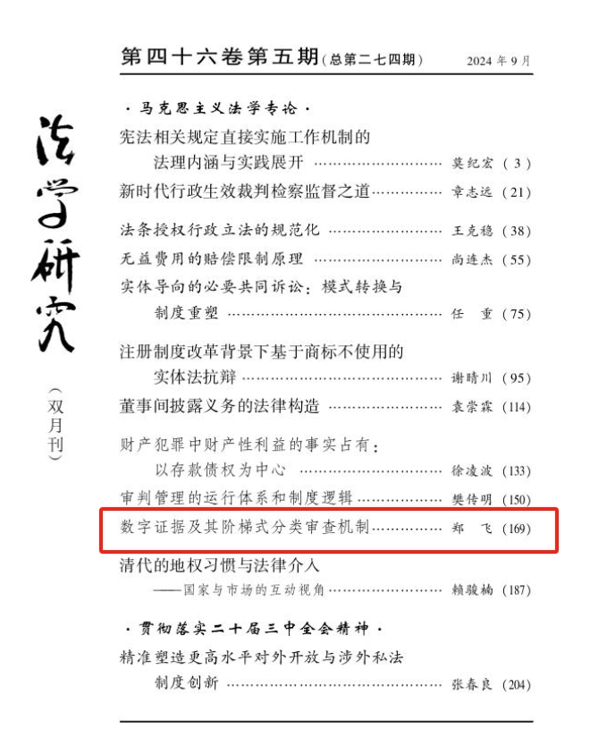 《法学研究》2024年第5期刊发了英国上市公司365副院长郑飞的最新论文《数字证据及其阶梯式分类审查机制》。这是郑飞在《法学研究》2021年第2期发表论文《证据属性层次论》之后,第二次在该刊发文。