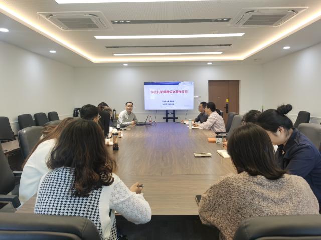 10月24日,邀请学校办公室文秘科科长常扬帆作了常用公文写作的专题培训。常扬帆老师从提高公文写作能力的重要性、公文写作的步骤、各类公文写作技巧等方面进行了讲解。同时根据自己的工作体会,结合实际案例,对公文格式规范和易犯错误进行了分析,并总结道:只有勤于学习、注重积累、善于思考、不怕吃苦、不断打磨,才能写出语言精炼、事项清晰、层次分明、格式标准的公文文稿。
