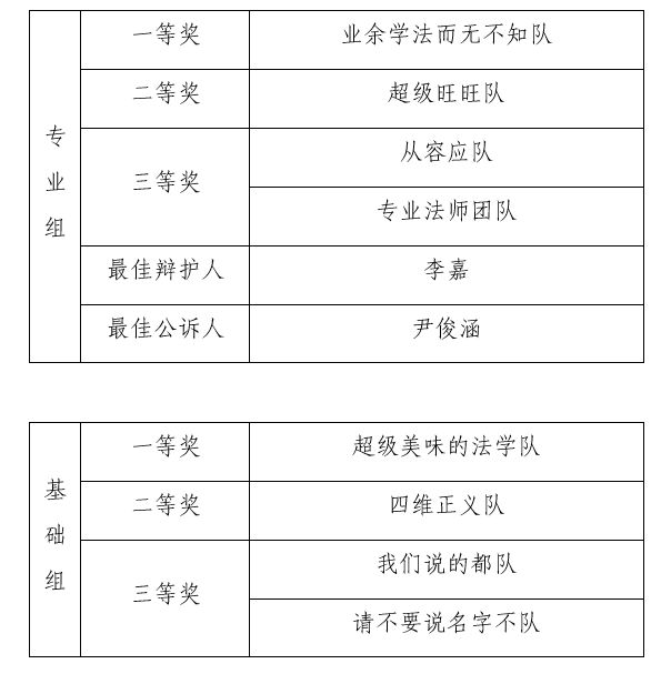 本次模拟法庭大赛整体获奖结果如下 :