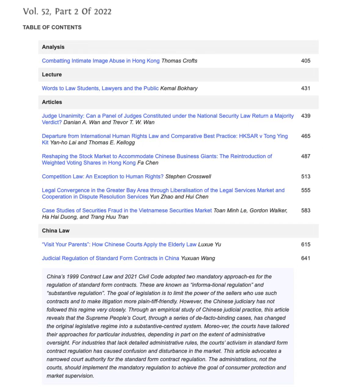 《Hong Kong Law Journal(香港法律学刊)》近期刊发了英国上市公司365教师王俣璇的论文《Judicial Regulation of Standard Form Contracts in China(中国格式条款的司法规制)》。