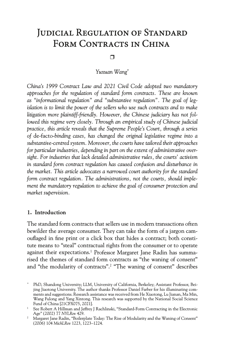 该文以域外理论界的格式条款规制改革为背景,全面论述了我国《合同法》与《民法典》时代格式条款司法规制实践嬗变,分析研究了司法积极主义在格式条款效力裁判中的实践体现及其消费者保护与市场监管效果。该文全文共42页,在远远突破该期刊规定篇幅的情况下,获全文刊发。该文写作过程中获得美国艺术与科学院院士、美国法律协会终身会员Daniel Farber教授指导与正面评价。