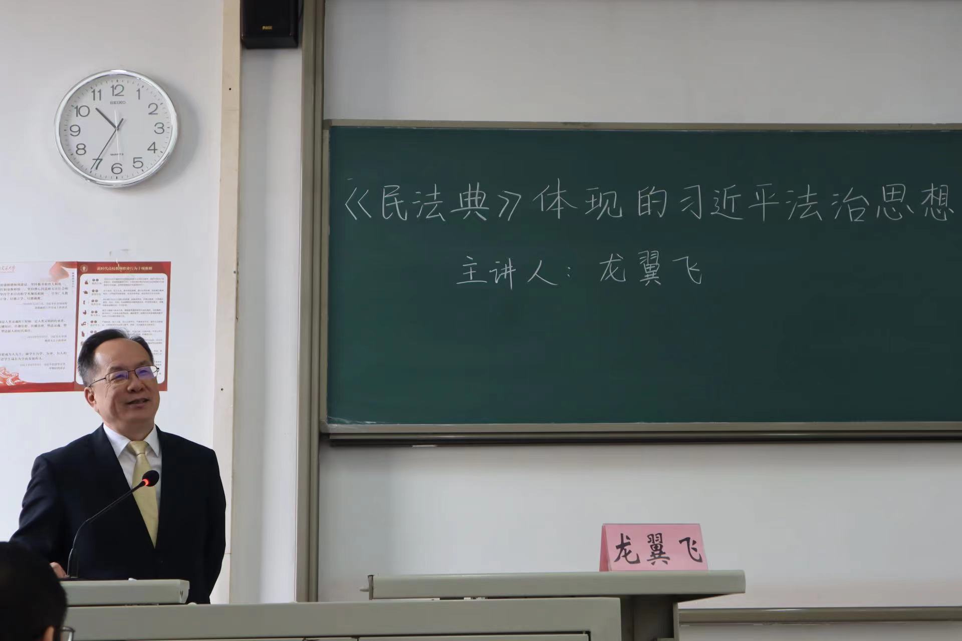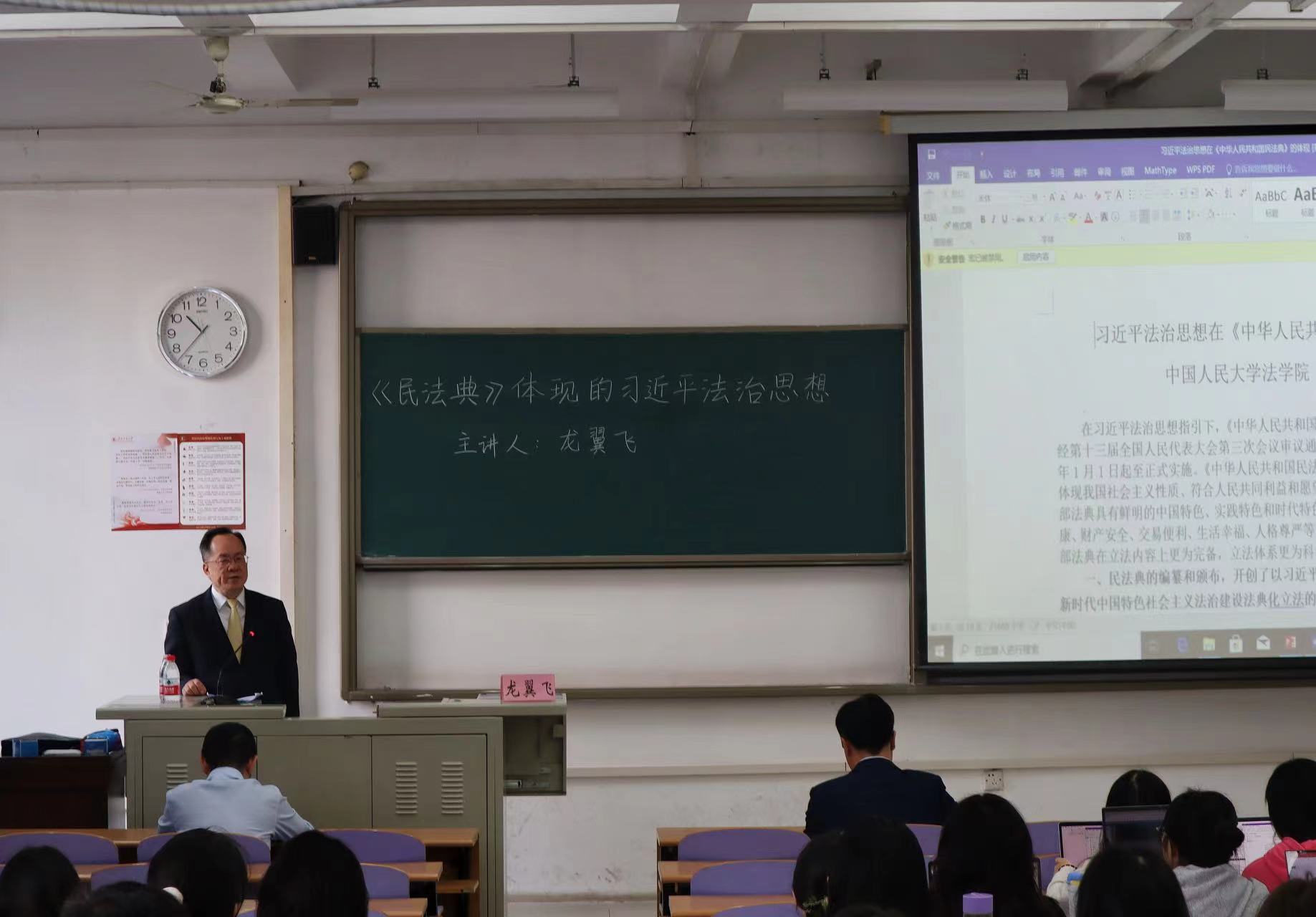 龙教授还阐述了习近平总书记对实施好《民法典》提出的基本要求,即"五个加强":加强《民法典》重大意义的宣传教育、加强民事立法相关工作、加强《民法典》执法司法活动、加强《民法典》普法工作以及加强我国民事法律制度理论研究。最后,龙翼飞教授与在场师生进行了互动交流,解答疑惑。